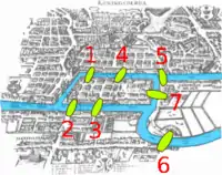 Семь первых мостов центра Кёнигсберга, соединяющие Альтштадт, Кнайпхоф, Ломзе и Форштадт, были построены в указанные ниже годы в следующем порядке[12]. Номера мостов в порядке их постройки показаны на рисунке справа.