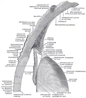 Верхняя половина сагиттального раздела передней части глазного яблока (задняя камера глаза помечена в центре справа)
