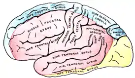 ![]() Наружная (внешняя) поверхность больших полушарий головного мозга, показывающая области, кровоснабжаемые теми или иными мозговыми артериями. Жёлтым показана область, кровоснабжаемая задней мозговой артерией. | |