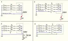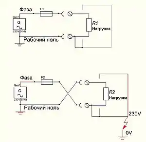 - Если ток утечки по цепи фаза-корпус-заземлитель достаточно велик (превышает порог срабатывания предохранителя, защищающего эту цепь), то предохранитель сработает и отключит цепь. Наибольшее действующее напряжение (относительно земли) на заземлённом корпусе составит Umax=RG·IF, где RG − сопротивление заземлителя, IF − ток, при котором срабатывает предохранитель, защищающий эту цепь. Данный вариант недостаточно безопасен, так как при высоком сопротивлении заземлителя и больших номиналах предохранителей потенциал на заземлённом проводнике может достигать довольно значительных величин. Например, при сопротивлении заземлителя 4 Ом и предохранителе номиналом 25 А потенциал может достигать 100 вольт.