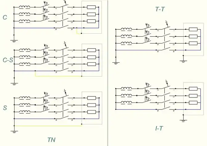 - Также можно наблюдать систему TN-C-S, где разделение нулей происходит в середине линии, однако, в случае обрыва нулевого провода до точки разделения, корпуса окажутся под линейным напряжением, что будет представлять угрозу для жизни при касании.