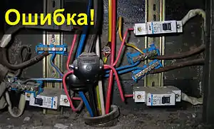 Пример неправильного монтажа: соединение рабочего нуля и PE-проводника на правой верхней клеммной колодке.