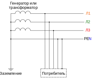 - Недостатки: крайне слабая защищённость от «отгорания нуля», то есть разрушения PEN по пути от КТП к точке разделения. В этом случае на шине PE со стороны потребителя появляется фазное напряжение, которое не может быть отключено никакой автоматикой (PE не подлежит отключению). Если внутри здания защитой от этого служит система уравнивания потенциалов (СУП) (под напряжением оказывается всё металлическое, и нет риска поражения током при прикосновении к 2 разным предметам), то на открытом воздухе никакой защиты от этого не существует вовсе.