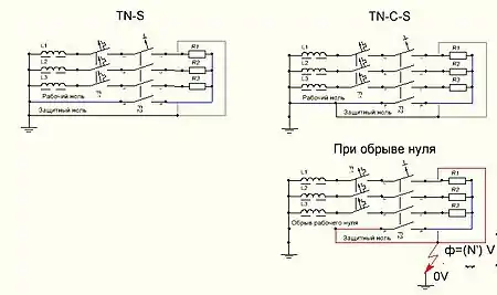 - система TN-C-S — система TN, в которой функции нулевого защитного и нулевого рабочего проводников совмещены в одном проводнике в какой-то её части, начиная от источника питания;