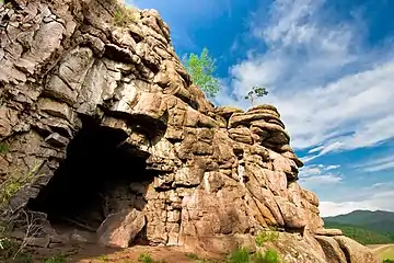 - Шаман-Гора - «Культовое место поклонения» - именно такое название носит местность в летописях Бурятии. На этом месте, в условиях часто меняющегося климата, располагалось поселение охотников на носорогов, диких лошадей и оленей. Раскопками вскрыта характерная картина палеолитического жилища и стоянок древнего человека. Чудной формы скалы, напоминающие морду волка и изображения людей, карабкающихся вверх. Имеются наскальные рисунки древних людей. По легендам здесь жил и камлала старый шаман.