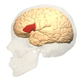 ![]() Центр Брока — вид сбоку. По исследованию 2016 года, у страдающих заиканием взрослых снижен региональный церебральный кровоток в верхней лобной извилине и в центре Брока. | |