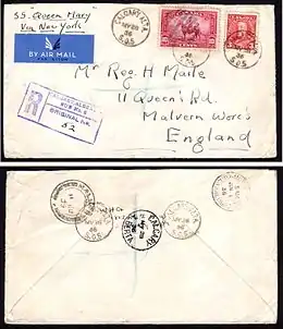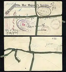 Регистрация писем в том виде, в каком она известна сегодня, была введена в 1841 году в Великобритании. Письмо должно было вкладываться в большой лист зелёной бумаги. Зелёный лист адресовался в почтовое отделение по месту жительства получателя. Затем зелёный лист использовался в качестве квитанции и возвращался в изначальное почтовое отделение после доставки письма. 1 июля 1858 года зелёный лист был заменён зелёной шёлковой лентой, а вскоре после этого — зелёной тесьмой. В 1870 году тесьму заменила зелёная бечёвка. После введения в употребление заказных конвертов в виде цельных вещей в 1878 году бечёвку сменили напечатанные синие перекрёстные линии. Синие перекрёстные линии сохранились на заказных письмах до наших дней[10].