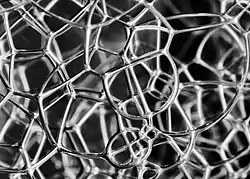 Пузырьки в мыльной пене. Мыльные пленки сходятся тройками под углом около 120 ° вдоль границ Плато, а эти границы соединяются в вершинах примерно под тетраэдрическим углом.