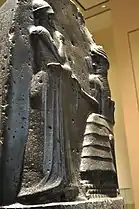 В соответствии с трактовкой сидящей фигуры почти все исследователи согласны в том, что в качестве стоящего перед Шамашем изображён сам царь Хаммурапи. Фигура Хаммурапи стоит перед богом в позе глубокой покорности и благоговейного внимания. Царь одет в длинную гладкую тунику с вертикально расположенными складками; на голове — шапка, окаймлённая ободком. Правая рука царя поднята к лицу, левая рука с подобранной туникой прижата к пояснице. Поза царя первоначально была истолкована Шейлем в том смысле, что Хаммурапи принимает законы от Шамаша под диктовку последнего. Однако большинство учёных склоняется к выводу, что поза царя является не более чем обычной молитвенной позой, обозначавшейся в Вавилоне термином «nîš kâti» («поднятие рук»). К тому же трактовка Шейля о даровании законов царю находится в противоречии с текстом самих Законов, где заявляется, что Законы обязаны своим происхождением самому Хаммурапи. Кроме того, если в прологе Хаммурапи заявляет о своём повиновении словам Шамаша, то в эпилоге он делает то же самое по отношению к Мардуку. Таким образом, царь не присваивал конкретному божеству полное авторство своих Законов, а лишь посвящал их ему[71].