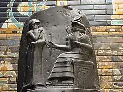 В верхней части лицевой стороны стелы высечена скульптура — барельеф, изображающий две фигуры, из которых одна сидит на троне, а другая стоит перед первой. Сидящий на троне одет в обычную вавилонскую одежду, отделанную оборками; на его голове — высокий четырёхъярусный убор вроде короны. В правой руке, протянутой вперёд, он держит жезл и кольцо, означающие прямоту и завершённость, то есть право и справедливость. Ноги сидящего опираются на древесные шишки, а из плеч исходят лучи. По общепринятому мнению исследователей, солнечные лучи, исходящие из плеч, указывают на то, что в качестве сидящей фигуры изображён Шамаш, бог солнца, света и оракулов. Шамаш как солярное божество был одним из излюбленных персонажей вавилонского искусства, где он часто изображён поднимающимся на востоке; этим, вероятно, объясняется и наличие древесных шишек у подножия трона, символизирующих скалы и горы, над которыми восходит солнце. Кроме того, выбор Шамаша в качестве сюжета для барельефа по всей видимости означает, что стела с Законами стояла в одном из храмов этого бога. На упоминаемом в тексте Законов экземпляре стелы, находившемся в вавилонском Эсагиле, возможно, было высечено изображение Мардука[69][70].