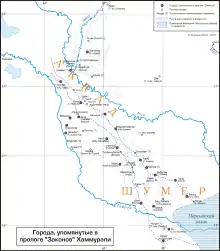 Содержащееся в прологе перечисление 26 городов организовано отчасти по теологическому, отчасти по географическому принципу. Первый блок (семь городов) имеет теологическую природу. В нём последовательно упоминаются Ниппур, Эриду и Вавилон (города главных божеств, которыми были Энлиль, Эа и Мардук), за которыми следуют четыре города, посвящённые астральным божествам: Ур (Син), Сиппар (Шамаш), Ларса (Шамаш) и Урук (Ану и Иштар). Города второго блока образуют своего рода круг в Центральной Вавилонии: он начинается в Исине, далее идёт на север (Киш и Кута), направляется на запад (Борсиппа), затем на юг (Дильбат) и возвращается в район Исина (Кеш). В третьем блоке сгруппированы города, расположенные вдоль Тигра и перечисленные снизу вверх по течению: он начинается в Лагаше-Гирсу, проходит через Забалам, Каркар, Адаб и Машкан-шапир и заканчивается в Мальгиуме. В четвёртую группу объединены самые поздние завоевания Хаммурапи: Мари и Туттуль, Эшнунна и Аккаде и, наконец, Ашшур и Ниневия. Некоторые важные города в прологе отсутствуют (например, Казаллу — по всей видимости потому, что Хаммурапи не пожелал упоминать имя города, который поднял против него мятеж незадолго до создания Законов)[132].