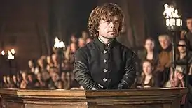 По возвращении в суд, Тайвин вызывает следующего свидетеля, которым неожиданно для Тириона оказывается Шая (Сибель Кекилли). Она даёт ложные показания, говоря, что Тирион и Санса вместе спланировали убийство Джоффри, заявляя, что Санса хотела мести за смерть её отца, матери и брата. Она рассказывает о сексуальных желаниях Тириона, унижая его перед судом и людьми, пришедшими на королевский суд. Прежде чем она смогла продолжить, Тирион окончательно приходит в гнев и заявляет, что он желает «признаться». В своей речи сперва он набрасывается на людей Королевской Гавани за их неблагодарность после того, как он спас их от Станниса Баратеона в битве при Черноводной, не позволив убить их всех. Глядя на Тайвина, он отрицает причастность к убийству Джоффри, но признает, что жалеет, что не убил его, и обвиняет отца в том, что тот предал его суду за его карликовость. Он заканчивает, говоря, что отказывается быть осуждённым за преступление, которого он не совершал, и что боги будут решать его судьбу, требуя испытания поединком.