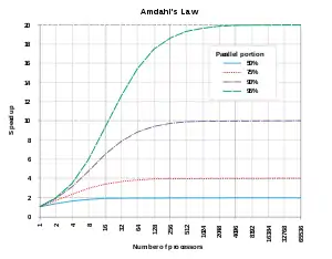 Зако́н Амдала (англ. Amdahl's law, иногда также Закон Амдаля — Уэра) — иллюстрирует ограничение роста производительности вычислительной системы с увеличением количества вычислителей. Джин Амдал сформулировал закон в 1967 году, обнаружив простое по существу, но непреодолимое по содержанию ограничение на рост производительности при распараллеливании вычислений: «В случае, когда задача разделяется на несколько частей, суммарное время её выполнения на параллельной системе не может быть меньше времени выполнения самого медленного фрагмента»[1]. Согласно этому закону, ускорение выполнения программы за счёт распараллеливания её инструкций на множестве вычислителей ограничено временем, необходимым для выполнения её последовательных инструкций.