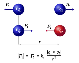 где — сила, с которой заряд 1 действует на заряд 2; — величина зарядов (со знаком); — вектор, направленный от заряда 1 к заряду 2 и по модулю равный расстоянию между зарядами (); — коэффициент пропорциональности.