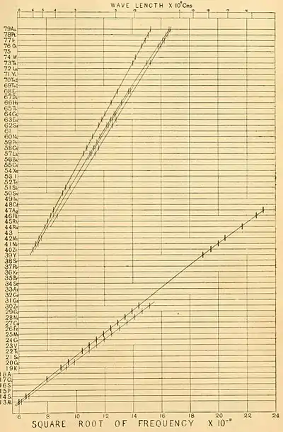 где c — скорость света, — постоянная Ридберга, — постоянная экранирования, — главное квантовое число внутренней орбитали, на которую осуществляется переход электрона, инициирующий излучение соответствующей линии, - главное квантовое число внешней орбитали, с которой осуществляется переход ( = 1, 2, 3... = , , ). На диаграмме Мозли зависимость от представляет собой ряд прямых (К-, L-, М- и т. д. серии, соответствующие значениям = 1, 2, 3,…).