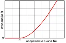 - Нагретый катод начинает испускать электроны. При подаче на анод достаточно большого положительного напряжения все испущенные электроны испытывают ускорение в межэлектродном пространстве и движутся к аноду. Электроны, находящиеся в межэлектродном пространстве, образуют пространственный заряд, искажающий электрическое поле в конденсаторе. При малых токах эмиссии и малой концентрации электронов в межэлектродном вакууме влияние пространственного заряда незначительно: потенциал всех точек межэлектродного пространства снижается, но поле во всех точках остаётся ускоряющим, поэтому почти все испущенные катодом электроны достигают анода. Ток анода равен току эмиссии катода и не зависит от анодного напряжения[11].