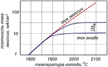 При достаточно высоких температурах на границе металла и вакуума возникает явление термоэлектронной эмиссии. Вольфрамовый катод начинает испускать электроны при температуре около 1400° С[5], оксидный катод — при температуре около 350° С[6]. С дальнейшим ростом температуры ток эмиссии экспоненциально возрастает по закону Ричардсона — Дешмана. Максимальная практически достижимая плотность тока эмиссии вольфрамовых катодов достигает 15 А/см2, оксидных катодов — 100 А/см2[7][8].