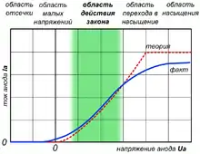 При анодных напряжениях порядка нескольких В и более (но до перехода в режим насыщения) закон достаточно точно описывает свойства реальных диодов. В этой области наблюдаются два рода отклонений от идеальной модели: