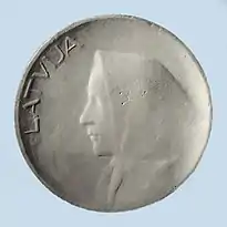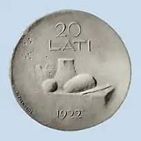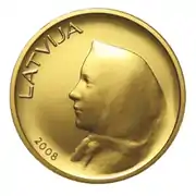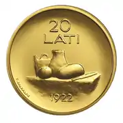 ![]() «20 латов» (1922). Гипс. Аверс | ![]() «20 латов» (1922). Гипс. Реверс | ![]() Монета «20 латов» (2008). По эскизу Т. Залькална. Золото. Аверс | ![]() Монета «20 латов» (2008). По эскизу Т. Залькална. Золото. Реверс | |||