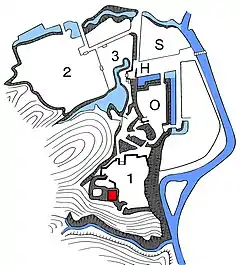 Замковый холм окружён рекой Хиросэ на севере и востоке, крутой скалистый склон защищает территорию с юга. Хотя естественная защита замка была достаточно мощной, искусственные защитные сооружения замка были минимальны, поскольку роль замка была в большей степени административной, чем военной. Внутренняя цитадель (1) имеет высоту около 115 м. К северу от неё находилась внешняя цитадель Ниномару[1] (2) и Санномару[2] (3), восточнее находилась цитадель высших самураев (S). Мост через реку, от которого дорога вела к главным воротам Омотэмон (H). Замок Хигасиномару был расположена над этой входной зоной. Фундамент главной башни замка (красный квадрат). Хоммару был защищён четырьмя трёхэтажными сторожевыми башнями. В Хоммару и Ниномару размещалась резиденция. Резиденция, расположенная в Хоммару, была построена в великолепном стиле периода Момояма и, как говорят, была сравнима с дворцом Тоётоми Хидэёси Дзуракудай в Киото.