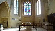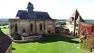 | Вид на верхний ярус часовни; правее, башня консьержа и вход | Надгробия Понса де Гонто (в центре) и Армана (справа) в верхней часовне | Вид на двухъярусную часовню из посёлка Бирон |