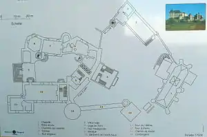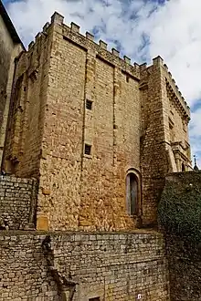Феодальная башня в замке, служившая символом власти сеньора, сохранилась до нашего времени без существенных перестроек и разрушений. По бокам башни расположены жилые помещения сеньоров, а на стенах башни и жилищ заметны красноватые отметины — следы пожаров, устроенных при осадах замка. Проёмы в виде полуциркульных арок позволяют датировать башню серединой XII века. Эшелонированное устройство башни, наряду с толщиной её стен, свидетельствуют не только о её оборонительной роли, но и о месте последнего убежища при нападениях и осадах неприятеля[2]. Башня с жилищами защищалась оградой, а этот комплекс, в свою очередь, был окружен ещё одной стеной, о наличии которой говорят наиболее древние части башни Сен-Пьер и башни казначейства.