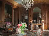 - Большая гостиная (Grand Salon) частично исполненная в стиле Людовика XV, в центре которой расположены стулья «courants» (их часто переставляли по необходимости), в узоре обивки которых использованы мотивы басен Лафонтена и экзотические персонажи, а вдоль стен гостиной расположены плетёные стулья «meublants» (их никогда не двигали); ширма с четырьмя створками, защищавшая от сквозняка, располагавшихся на кушетке гостей; камин украшен натуральным морским гребешком; все четыре стены гостиной декорированы обшивочными панелями; большую часть паркетного пола закрывает ковёр, который убирали когда комната не использовалась; над каминной полкой расположено зеркало, составленное из пяти элементов, по французской технике начала XVII века, когда ещё отсутствовала технология изготовления цельного зеркала большого размера; центральная часть плафона окрашена в синий цвет и окаймлена декоративным карнизом.