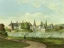 Построенное в 1679 году трехэтажное здание под вальмовой крышей, порталом из песчаника и угловыми башнями с грушевидными куполами имеет длину 94 м. С западной стороны имеется крыльцо с 14-ю ступенями, выходящее на террасу XIX века.