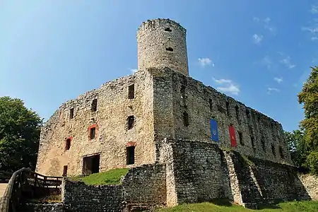 Наиболее показательной частью замка является четырехэтажная башня на плане круга, высотой около 30 м, которая является самой старой частью здания и датируется второй половиной XIII — началом XIV века. Сначала она была типичным донжоном, то есть отделенным оборонительным элементом, расположенным вблизи с воротами и предназначенным для усиления ее военного потенциала, а также последним пунктом сопротивления во время захвата крепости. Это типичное оборонное решение, которое широко применялось в средневековых крепостях. Вход в башни находился на значительной высоте — примерно посередине башни. В XV веке башня была перестроена и включены в конструкции верхнего замка. Тогда же было приспособлено к тогдашним военным требованиям, путем создания на отдельных этажах пушечных отверстий, предназначенных для тарасниц. Таким образом, замок можно было защищать на определенном расстоянии огнем из башни по прилегающим районам. Нижние части башни содержали тюремные подземелья, в которые приговоренных спускали через отверстие в полу, находящееся неподалеку от ее входа. Внутри башни можно было передвигаться по узким и извилистым каменным ступеням. Верхний ярус башни не сохранился — на верхушке нынешней башни виднеются следы от него в виде каменных опор, которые поддерживали стену внушительной толщины. Башня имела наклонную коническую крышу. В наше время на вершине башни находится смотровая площадка, огражденная металлическими перилами, которая открыта для посещения туристами.