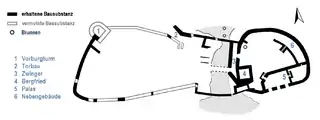 Передовой замок имел размеры 45 на 75 метров. Его окружала стена толщиной 2 метра и периметром — 180 метров. В северо-западном углу сохранились остатки башни подковообразной формы (на схеме обозначен цифрой «1»). Толщина стен башни составляет 4,5 метров, предполагается, что раньше таких башен было восемь. В северной части находились въездные ворота («2»). Фахверковый дом в северной части замка был построен только в XX веке.