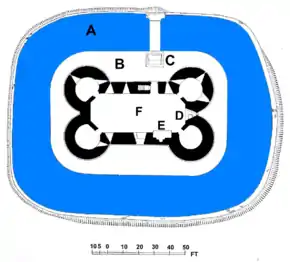 План замка. A — ров, B — насыпь, C — подъёмный мост, D — стена, E — очаг, F — башня