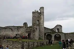 | Северо-восточные («первые») ворота замка | Вид на руины «Старых палат» (слева) и «Жижковой» башни в западной части первого двора | Вид со стороны конюшни на «третьи» ворота замка в восточной части первого двора | Вид на «пятые» ворота в северной части второго двора, на переднем плане колодец |