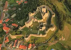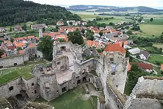 Ареал замка состоит из трёх разделённых между собой крепостными стенами дворов с собственными воротами, укреплёнными решётками и подъёмными мостами. От главных («первых») ворот на северо-востоке замка начинался первый или Большой, самый обширный замковый двор, занимающий добрую половину всего замкового ареала. В этом дворе размещались казармы и жилища слуг, в центре двора находились конюшни, построенные на месте первоначального замкового рва; здание конюшен сохранилось до наших дней. В восточной части первого двора, судя по характеру развалин, помещались темницы, из которых через специальный коридор можно было попасть во второй или Малый двор замка. На западной стороне Большого двора, севернее донжона, возвышаются руины четырёхугольной «Жижковой» башни, возведённой во время расширения и укрепления замка Брженеком Швиговским из Ризмберка в конце XIV века. Башня охраняла «четвёртые» ворота замка и получила своё название благодаря тому, что именно возле неё в 1421 году гетман таборитов Ян Жижка лишился своего второго глаза. Вторая четырёхугольная башня, названная «Голодной», была возведена в то же время на северо-востоке от Малого двора и позднее стала частью «Брженкова» дворца, известного также под названием «Новые палаты». Обширные руины «Брженкова» дворца занимают восточную часть замкового ареала, примыкая на западе к «пятым» воротам, соединяющим Большой и Малый дворы замка. Севернее дворца сохранились «третьи» замковые ворота с башней, охранявшей доступ в замок с востока. Руины старого дворца («Старых палат») располагаются в западной части первого двора между «Жижковой» башней (на севере) и «пятыми» воротами (на юге)[15][25][26][27].