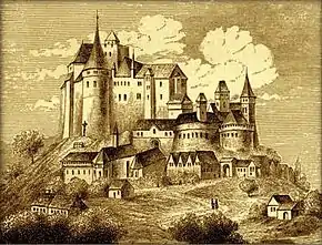 ![]() Вид на замок с северо-востока, на переднем плане замковый костёл Пресвятой Троицы | |