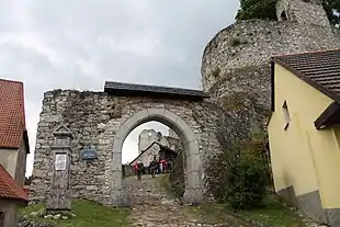 Замок обнесён каменной крепостной стеной толщиной в несколько метров с округлыми и четырёхугольными крепостными башнями. Самая большая башня, в сечении имеющая многоугольную форму, расположена с западной стороны замка. В северо-западной части стены находится относительно хорошо сохранившаяся небольшая прямоугольная башня[15].