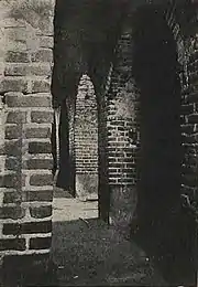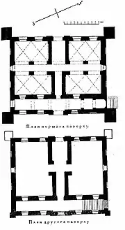 Нижний этаж, который предназначался для служебных комнат, составляли четыре одинаковые по размерам прямоугольные в плане помещения, отделенные друг от друга взаимно перпендикулярными коридорами[2]. Залы соединялись с боковыми коридорами широкими арочными проемами[1]. Каждое помещение было перекрыто парой крестовых сводов, а коридоры — цилиндрические. На верхнем этаже было две больших комнаты[2].