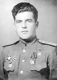 Указом Президиума Верховного Совета СССР «О присвоении звания Героя Советского Союза генералам, офицерскому, сержантскому и рядовому составу Красной Армии» от 10 января 1944 года за «образцовое выполнение боевых заданий командования на фронте борьбы с немецко-фашистскими захватчиками и проявленные при этом отвагу и геройство» удостоен звания Героя Советского Союза с вручением ордена Ленина и медали «Золотая Звезда» (№ 874)[2].