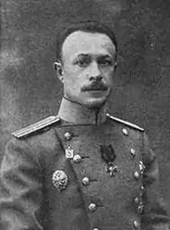 За то, что в ряде боев, веденных дивизией с 20 августа по 7 сентября 1914 г., талантливо и энергично выполнял возложенные на него задачи, всегда находясь в наиболее опасных местах, при чем в бою 20 августа 1914 г. овладел и удержал в своих руках деревню Сивалька, послужившую отличным исходным пунктом для атаки высоты 107.5 в овладении которой на следующий день он принял самое энергичное участие.