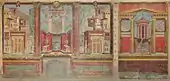 Реставрация фрески из спальни древнеримской виллы, около 50—40 года до н.э., размеры комнаты: 265,4 x 334 x 583,9 см, в Метрополитен-музее (Нью-Йорк)
