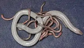 ![]() Самка желтоточечной червяги с молодью | ||||||||||