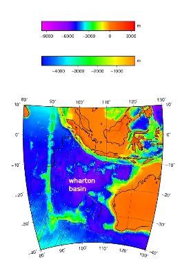 Преобладает расчленённый холмистый рельеф дна. Глубина составляет 5000—6500 м, на отдельных поднятиях падает до 1555 м. Близ Австралии имеются крупные горные массивы, представляющие собой, по-видимому, остатки древних материковых структур. Грунты дна слагают красные глины, радиоляриевые и фораминиферовые илы. Широко развиты железо-марганцевые конкреции; на вершинах гор и холмов — выходы коренных пород[1].