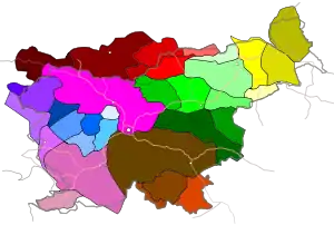 Словенский языковой ареал составляют семь диалектных групп — каринтийская, приморская, ровтарская, гореньская, доленьская, штирийская и паннонская[16]. В ряде регионов Словении и в соседних с ней странах формируются областные разговорные языки, отчасти вытесняющие некоторые словенские диалекты. Данные языки представляют собой местные наддиалектные образования. Выделяются центральнословенский, южноштирийский, северноштирийский, приморский, ровтарский и каринтийский разговорные языки[17]. На основе словенских диалектов развиваются или развивались в прошлом также несколько малых литературных языков: на базе приморских диалектов в Италии — резьянский и венецианско-словенский языки, на базе паннонских диалектов в Венгрии — прекмурско-словенский[18].