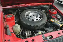 В некоторых автомобилях запасное колесо находится в отсеке двигателя. Например в Renault 14, автомобилях ВАЗ «Нива», «Ока», ЗАЗ «Запорожец» и в старых моделях Subaru, таких как Subaru Leone. Сегодня подобное расположение запасного колеса считается опасным, так как жёсткое колесо мешает нормальной деформации передка автомобиля при аварии, передавая возникающие при этом силы на щит моторного отсека и, соответственно, в пассажирский салон.