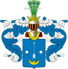 В щите, имеющем голубое поле, изображён золотой полумесяц, у которого над рогами видны две серебряные шестиугольные звезды, и посередине их того же металла стрела, летящая вверх.