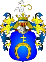 В голубом поле золотая подкова шипами вниз, на ней золотой равноконечный крест с широкими концами. На щите коронованный шлем. Нашлемник встающая борзая натурального цвета с голубым ошейником вправо. Намёт голубой подложенный золотом.