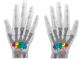 | Дистальный | головчатая | ладьевидная, полулунная | трапециевидная, крючковидная | вторая, третья и четвёртая пястные |