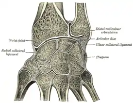 Вертикальный срез через суставы запястья, демонстрирующий суставные полости.