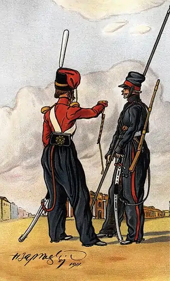 Рядовой Лейб-гвардии Гусарского полка (парадная форма; слева) и рядовой Изюмского гусарского полка (походная форма).