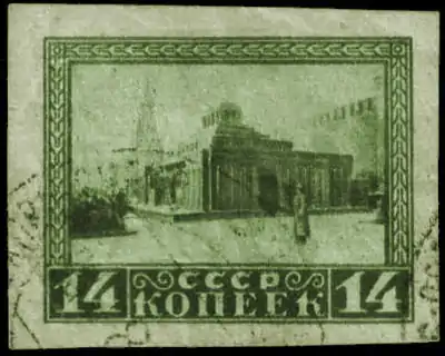 Марка СССР «Мавзолей В. И. Ленина» работы В. В. Завьялова, орнаментальная рамка по эскизу Р. Зариньша, 1925 (ЦФА [АО «Марка»] № 212)