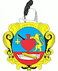 В голубом поле сердце, пронзённое сломанным копьём и сопровождаемое: справа — кавалерским крестом и слева — львом; в оконечности — в красном поле лодка с пушкою.
